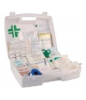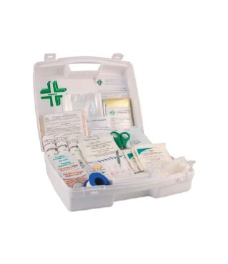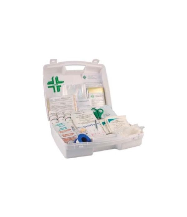 1 kit coussin hémostatique - 1 couverture de survie - 2 écharpes triangulaires - 2 sacs en plastique - 12 pansements adhésifs 20 mm x 72 mm - 8 pansements adhésifs 53 mm x 70 mm - 10 compresses stériles individuelles 20 cm x 20 cm - 2 sachets de 5 compresses stériles 7.5 cm x 7.5 cm - 3 bandes extensibles de 3 m x 5 cm - 3 bandes extensibles de 3 m x 10 cm - 1 rouleau de sparadrap sécable de 5 m x 2 cm - 1 paire de ciseaux 13 cm à bouts ronds - 1 pince à échardes à mors plats - 5 paires de gants jetables - 12 épingles de sûreté - 10 compresses à la chlorhexidine - 10 compresses dalcool à 70 °- -2 tampons hémostatiques pour le nez - 4 dosettes de sérum physiologique stérile - 1 feuillet premiers soins.