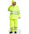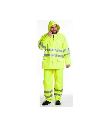 CLASSE 2 100% POLY ENDUIT PU. 2 P PLAQUEES FERMETURE PAR RABAT, 1 P INTERIEURE. CAPUCHE FIXE AVEC RANGEMENT DANS LE COL FERME PAR BANDES AGRIPPANTES. POIGNETS COUPE-VENT BORDS COTES. FERMETURE A GLISSIERE SOUS RABAT A BOUTONS PRESSIONS CONFORME NORME EN 471 + EN343.PANTALON 2 PASSE-MAINS SERRAGE TAILLE PAR ELASTIQUE - SERRAGE EN BAS PAR BOUTONS PRESSIONS CONFORME A LA NORME EN 471 + EN343.